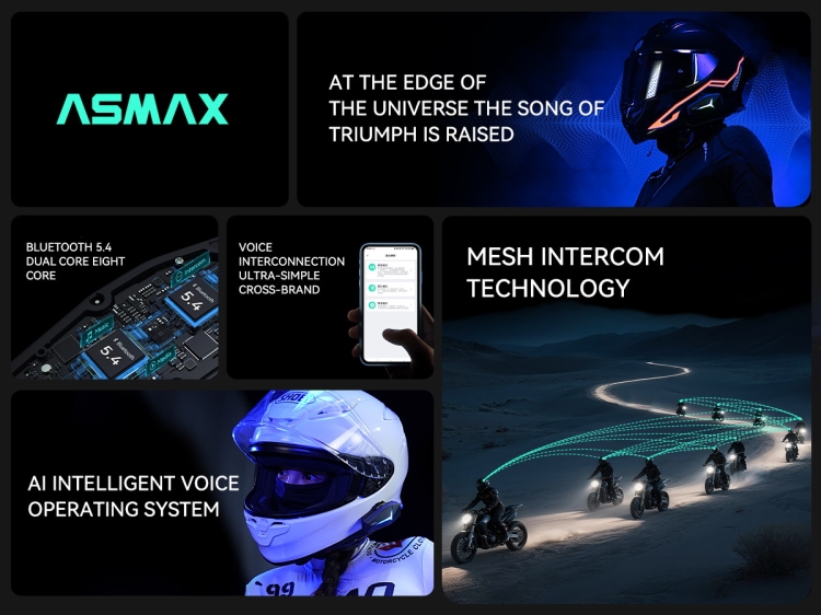 Intercom Asmax FUTURE 1 zprostredkuje spoľahlivou a bezpečnou komunikáciou počas vašich jázd na motorce, ako s vašimi spoločníkmi motorkáři, tak aj so spolujezdcom. Kompaktní Mesh moto intercom FUTURE 1 je priamo určený pre bezpečnú komunikáciu až 10 jazdcov s Asmax interkomy v uzavretých skupinách, v rámci Mesh modu je schopný prepojiť do vzdialenosti až 3 km. Ve volném režimu"Free mode" umožňuje automatické spojenie až pre 50 účastníkov s interkomy Asmax. Celková doba používania na jedno nabitie je 16-24 h, pohotovostný režim 4-5 dní, ultratiché nabíjanie cca 50 minút. Všetko možno ovládať cez aplikáciu ASMAX, stačí sa pripojiť a vyraziť na cestu.