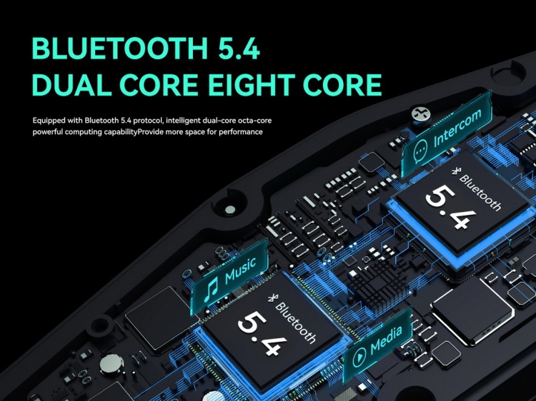 - Dvojitá architektura Bluetooth 5.4. se čtyřjádrovým procesorem umožňuje velmi výkoný algoritmus, nizkou spotřebu energie vynikající stabilitu do vzdálenosti až 3km