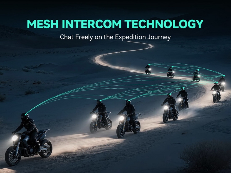 Inteligentní Mesh intercom pro 10 účastníků uzavřené skupiny nebo až 50 účastníku ve volném režimu, skupinový dosah až 3km (Mesh), doba hovoru až 16h, AI hlasové ovládání, FM rádio, redukce šumu ENC, voděodolnost IPX7, univerzální a snadné párování, připojení přes bluetooth 5.4, kompaktní rozměry.